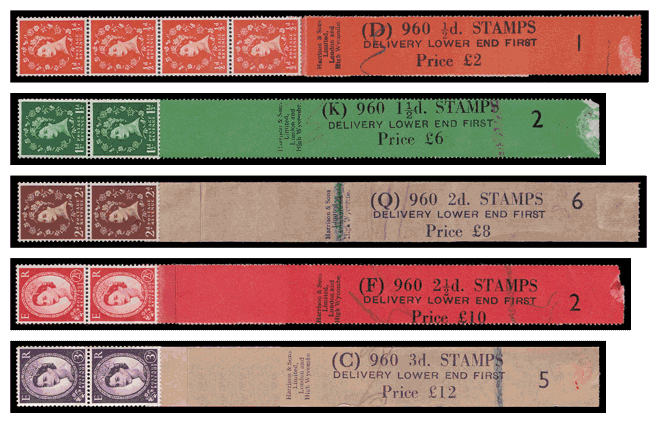The first Wildings with St. Edward’s Crown watermark were issued in September 1955, and some rolls containing these stamps were issued in the same month. The full set of 27 rolls were produced, although roll (U) was changed from 2½d to 3d, and initially no (B) rolls were produced as 1951 changes in postal rates had reduced the demand and there was sufficient stock of earlier rolls, which lasted until March 1958.